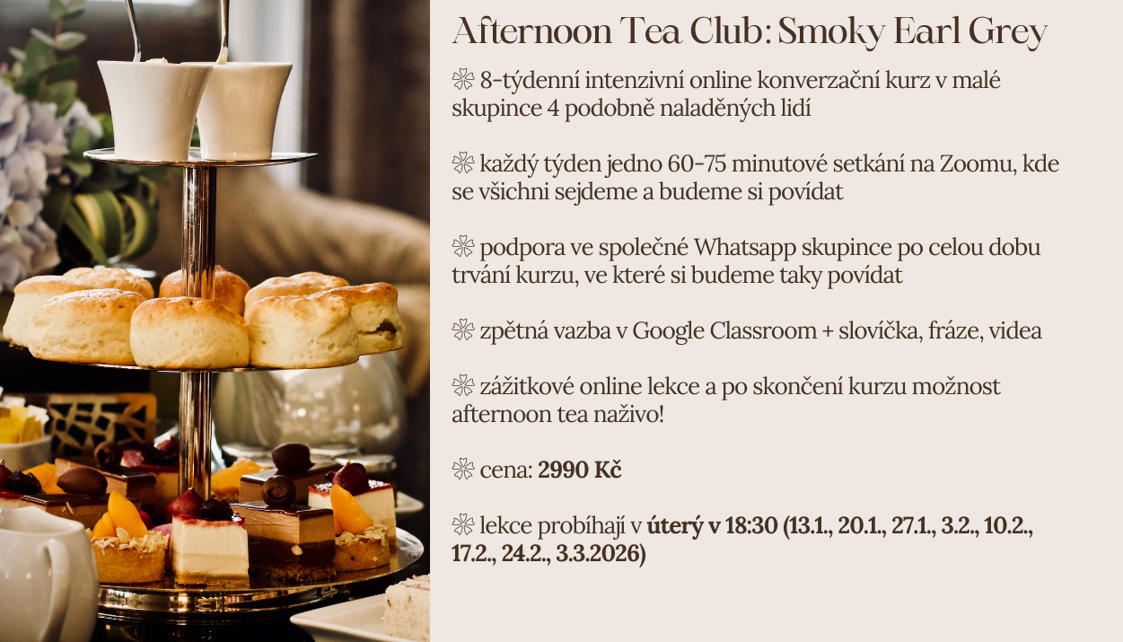 Afternoon Tea Club: Smoky Earl Grey je intenzivní online konverzační kurz angličtiny. V průběhu osmi týdnů si nejen dáte mnoho čajů s malou skupinkou podobně naladěných lidí, ale rozmluvíte se a překonáte obavy z aktivního používání cizího jazyka.