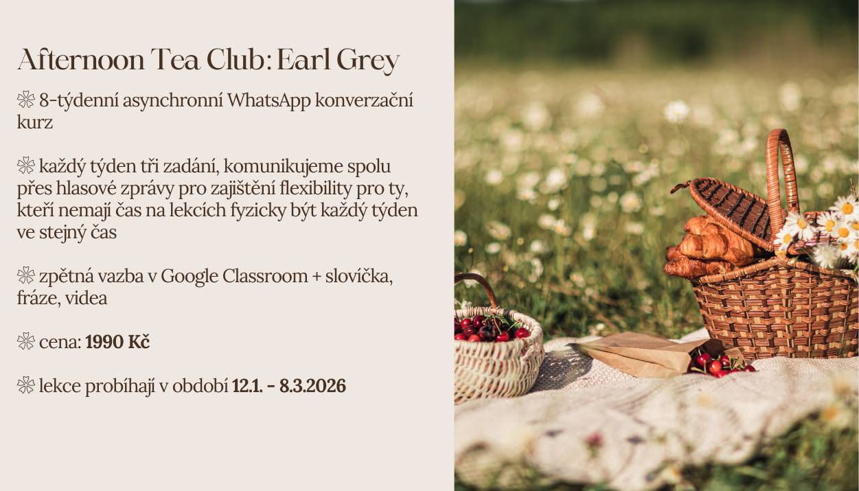 Afternoon Tea Club: Earl Grey je méně intenzivní verze konverzačního klubu pro ty, kteří nemají možnost se vídat každý týden. Čekají nás čtyři setkání v průběhu osmi týdnů a propojení přes Whatsapp v mezičase.